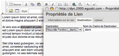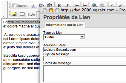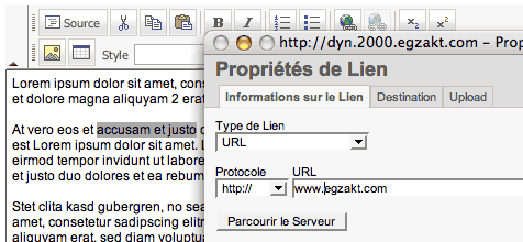Surlignez le texte que vous désirez rendre cliquable et cliquez sur l’icône « lien ». Une petite fenêtre flottante (popup) apparaîtra.