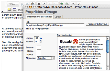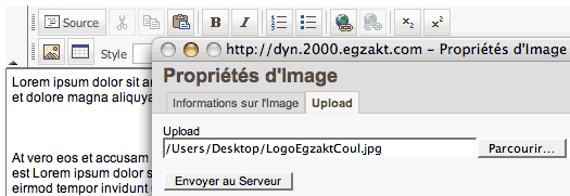 Upload :Placez votre curseur à l’endroit où vous désirez mettre l’image. Cliquez sur l’icône « image ». Une petite fenêtre flottante (popup) apparaîtra. Allez dans l’onglet « Upload ». Pour envoyer votre image sur le serveur, cliquez sur le bouton « Parcourir » et sélectionnez-la. Pour confirmer le transfert, cliquez sur le bouton « Envoyer au serveur ». Un message de confirmation vous indiquera que le transfert s’est bien effectué. Si l’image est lourde, le transfert peut prendre plus de temps. Pour confirmer l’ajout de l’image, cliquez sur le bouton « ok ». ![]() Aperçu : Vous serez maintenant dirigé dans l'onglet « Informations sur l'image ». Vous pouvez voir un aperçu de l'image, et modifier son alignement par rapport au texte, si nécessaire. Il est également possible de modifier la taille de l'image en ajustant les champs « largeur » et « hauteur ». Le redimensionnement conserve les proportions. Cependant, pour de meilleurs résultats, il est toujours préférable d'utiliser un logiciel de retouche d'images, comme Photoshop. Si tout est à votre goût, cliquez sur « ok » pour ajouter l'image dans le texte. ![]() |